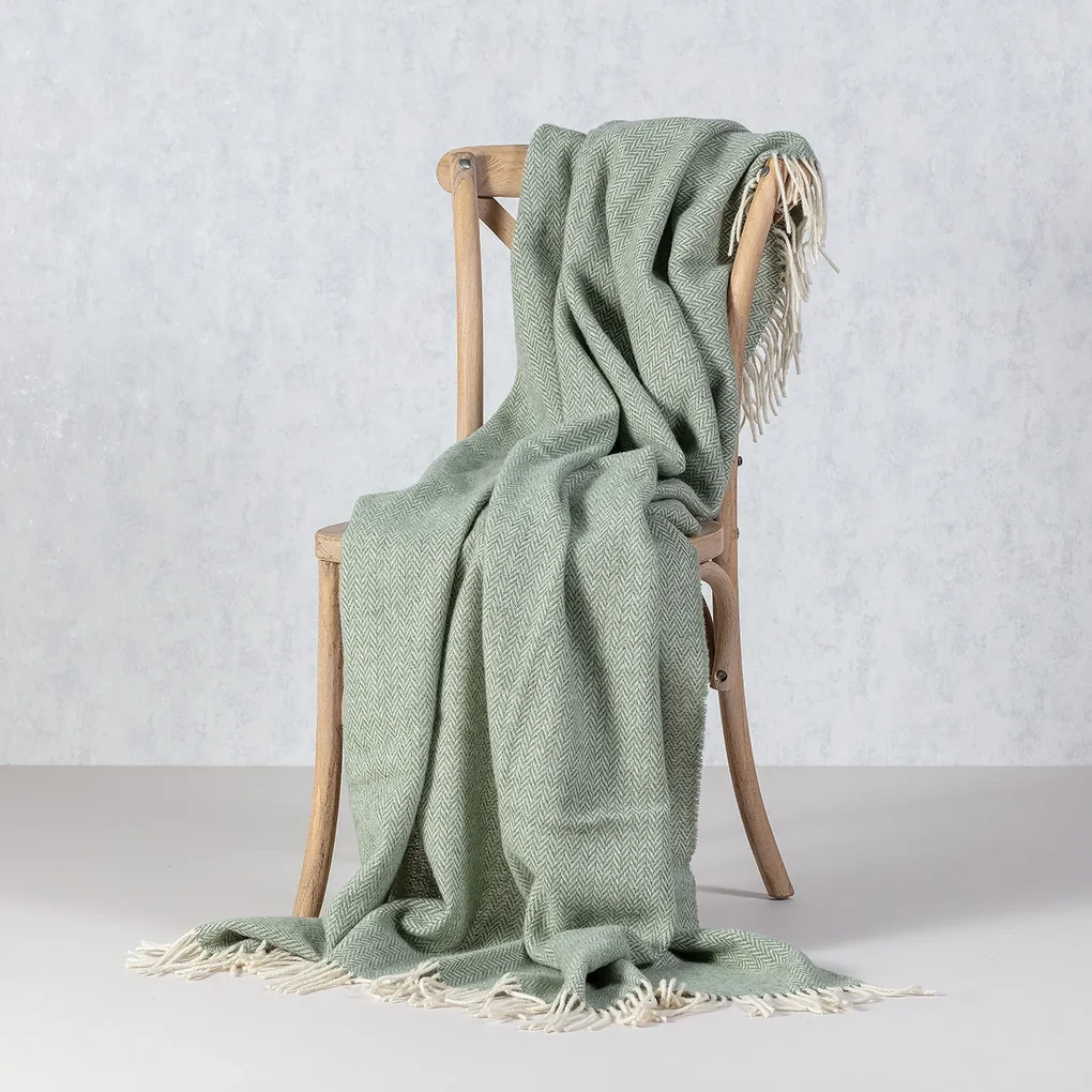 Wełniany pled w kolorze zieleni z ozdobnymi frędzlami. Owiń się w wełniany pled we wzór w jodełkę, który będzie Twoim niezastąpionym towarzyszem w chłodniejsze wieczory i poranki. Ten doskonały dodatek do wnętrza, zapewni wyjątkową wygodę i komfort zarówno podczas oglądania ulubionego serialu, jak i spokojnego snu. Staranne wykończenie nadaje mu niepowtarzalnego charakteru, dzięki czemu idealnie wpasuje się w różne aranżacje i stylizacje wnętrz. Zamów już dziś niezawodny wełniany pled na łóżko i kanapę i otul się przyjemnym ciepłem oraz wyjątkowym stylem. Pled Zelandia dostępny w różnych kolorach, pozwoli Ci dopasować go do Twoich preferencji oraz wystroju pomieszczenia. Wymiary: szer. 140 cm, dł. z frędzlami 200 cm. Skład: 100% wełna typu New Zealand.