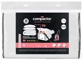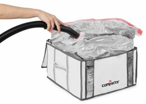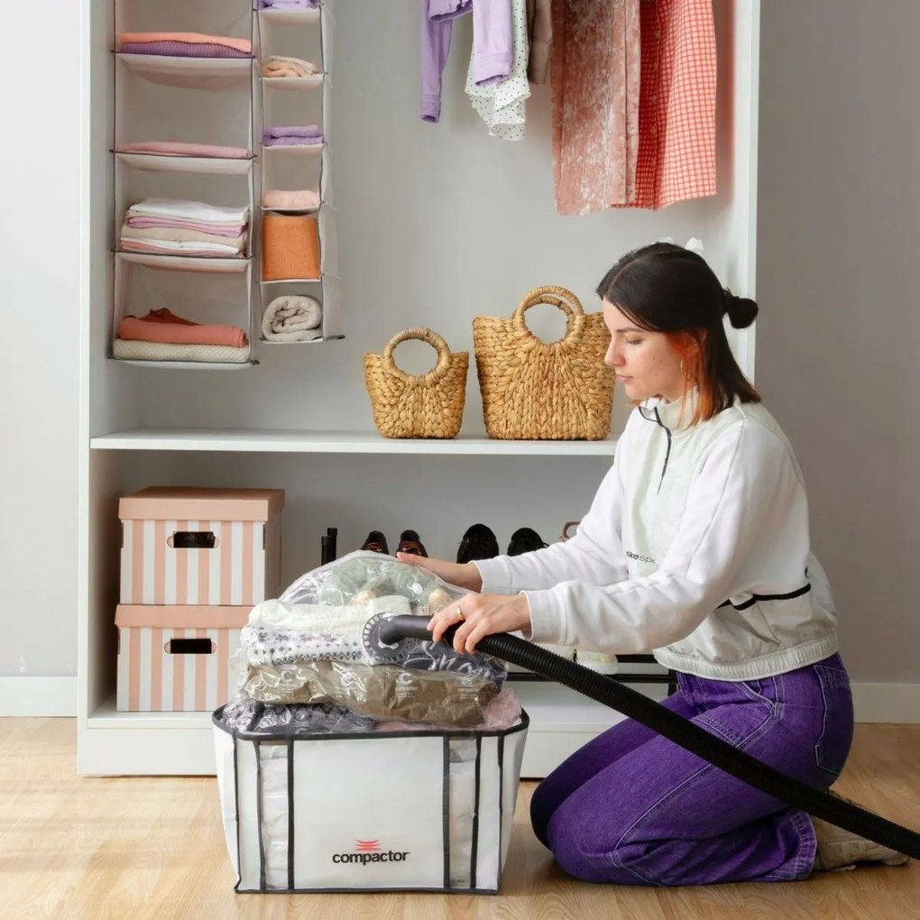 Praktyczny pojemnik do przechowywania z wewnętrznym workiem próżniowym to efektywny sposób przechowywania ubrań i innych tekstyliów. Pojemnik do przechowywania Compactor Life M wykonano z polipropylenu, a dzięki temu jest wysoce wytrzymały. Można włożyć do niego dużą ilość na przykład ubrań sezonowych. Powietrze z worka wewnętrznego można odessać za pomocą odkurzacza. Można zastosować w tym celu dowolny model odkurzacza. Worek posiada praktyczny zamek i uchwyty ułatwiające przenoszenie. Pojemnik do przechowywania chroni materiały przed kurzem, roztoczami i molami.