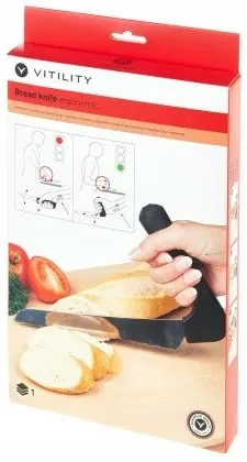Nóż do pieczywa usprawniający krojenia chleba, bagiet. Wygięta rączka usprawnia krojenie. Ergonomicznie wyprofilowany, by wygodnie leżał w dłoni.
