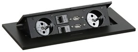 · stoły o ponadczasowym wzorze do nowoczesnych i reprezentacyjnych biur oraz sal konferencyjnych · stół jest bardzo stabilny i solidny, można go łączyć z meblami w tym samym wzorze z serii PRIMO · blat wykonany z płyty wiórowej laminowanej o grubości 18 mm, zabezpieczony trwałą krawędzią ABS · wykończenie powierzchni metalowego stelażu lakierem proszkowym w odcieniu srebrnoszarym lub czarnym · dostarczany w stanie rozłożonym · na komfort podczas spotkań wpływają także gniazda wpuszczane, które służą do zasilania urządzeń biurowych i urządzeń mobilnych, lub do przesyłania danych Port blatowy TYP III - wpuszczany, 2 gniazda, 2x port USB, 2x port RJ45 · listwa gniazdowa chowana w blat to eleganckie, proste i praktyczne urządzenie nadające się do montażu w blatach, stołach i meblach · doskonale pasuje do pomieszczeń biurowych czy konferencyjnych · zawiera, oprócz klasycznych gniazd, praktyczne porty danych USB do przesyłania danych (informacji) oraz porty sieciowe RJ-45 do podłączenia do sieci LAN · materiał: stop cynku + żelazo · Wymiary dolnej części: 224 x 109 x 65 mm (dł. x szer. x wys.) · Wymiary zewnętrzne: 266 x 133 x 69 mm (po otwarciu pokryw 266 x 133 x 112 mm) · Otwór montażowy: 225 x 110 mm Jeden port zawiera: · 2x gniazdo (typ francuski) 110-240V 50/60Hz 10A · 2x port Ethernet (RJ-45) cat5E · 2x port USB 2.0
