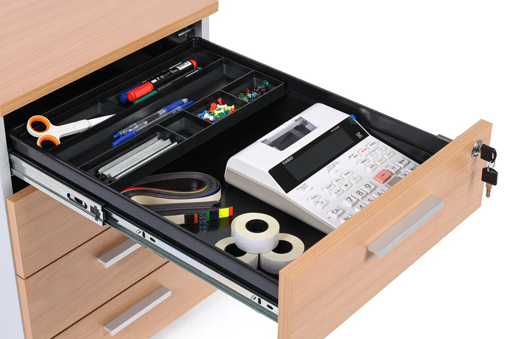 · z laminowanej płyty wiórowej o grubości 18 mm, ABS 1 mm · centralny zamek bębenkowy z dwoma kluczami (w zestawie) · kontener na kółkach · plastikowe szuflady o nośności 5 kg · uchwyty z polerowanego aluminium