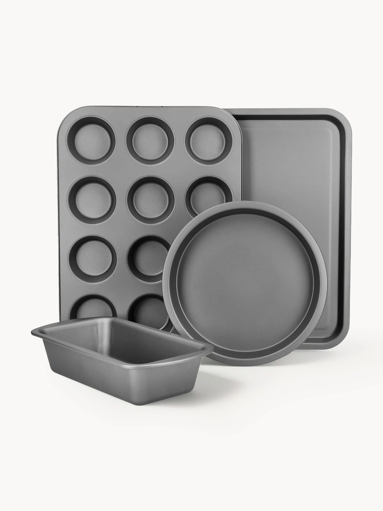 Ten 4-elementowy komplet form do pieczenia składa się z 1 formy do ciast, 1 okrągłej formy do pieczenia, 1 blachy do pieczenia i 1 formy do muffinek. Komplet posiada nieprzywierającą powłokę, która ułatwia czyszczenie i użytkowanie.