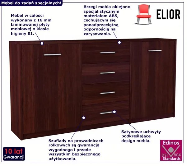 Sobota - dzień wielkich porządków w domu. Sprzątnie, pranie, prasowanie i składanie ubrań - to czynności, które zna każda z Nas! Masz wrażenie, że w jakiś czarodziejski sposób ciągle mnożą Ci się ubrania? Mija weekend, a w sypialni na Twoim ulubionym fotelu znowu piętrzą się bluzki, spodnie, sukienki i skarpetki? Istne szaleństwo! Do tego w każdym pomieszczeniu zbierasz porozrzucane zabawki, gry planszowe i przybory do malowania. I znowu wieczorem zmęczona po pracy zamiast usiąść na tarasie i chwilę się zrelaksować ogarniasz dom. Teraz usiądź i popatrz co przygotowali nasi projektanci specjalnie dla Ciebie... Rewelacyjna komoda marki Elior - dodatkowa przestrzeń na ubrania, zabawki, dokumenty i wiele innych rzeczy, które do tej pory ciągle pojawiały się na Twojej drodze! Mebel do zadań specjalnych Masz już dosyć upychania swoich rzeczy w przepełnionej szafie? Nie kupuj dodatkowych plastikowych pojemników, które ustawiasz za drzwiami od sypialni, bo to rozwiązanie tylko na chwilę. Zdecyduj się na komodę marki Elior, która świetnie sprawdzi się zarówno w salonie, sypialni, pokoju dziecka czy przedpokoju. Cztery szuflady oraz dwie pojemne półki ukryte za drzwiczkami pozwolą Ci przechować w niej dosłownie wszystko! Nie obawiaj się, że nie wpasuje się ona do Twoich mebli - gwarantujemy Ci, że dzięki bogatej, stonowanej kolorystyce na pewno wybierzesz coś dla siebie. Komoda marki Elior to hit, którego nie może zabraknąć w Twoim domu! Tylko sprawdzone materiały Komoda marki Elior charakteryzuje się minimalistyczną konstrukcją i lekką prostą formą. Mebel wykonany został z laminowanej płyty meblowej o klasie higieny E1, uszlachetnionej cienkimi filmami melaminowymi. Posiada także specjalne włókna ułożone różnokierunkowo o strukturze sinusoidalnej, co zapewnia nadanie mu cech jakościowych oraz wytrzymałościowych. Dla zwiększenia wytrzymałości i trwałości, obrzeża komody wykończono odpornym na uszkodzenia mechaniczne obrzeżem ABS. Szuflady na prowadnicach rolkowych są gwarancją wygodnego i przede wszystkim bezpiecznego użytkowania, a piękne satynowe uchwyty podkreślają cudowny design mebla. Postaw ten wyjątkowy mebel w swoim wnętrzu i przekonaj się jak wszystko się świetnie układa! Atuty komody marki Elior: Zgrabna i lekka wizualnie forma.Ponadczasowa kolorystyka, do której łatwo dobrać inne meble i dodatki.Idealna zarówno do klasycznych, jak i nowoczesnych aranżacji.Wykonana z profesjonalnej płyty MDF laminowanej.Poniżej przedstawiamy Ci wszystkie wersje kolorystyczne komody marki Elior. Chcesz zobaczyć inną wersję? Zapraszamy tutaj . Najważniejsze informacje: - Wymiary: szerokość mebla:177 cm, głębokość mebla: 35 cm, wysokość mebla: 75 cm. - Gwarancja: 10 lat (inni producenci oferują maksymalnie 24 miesiące gwarancji. Tylko u nas otrzymujesz pełną jakość potwierdzoną aż 10-letnią gwarancją). - Materiał: profesjonalna, trwała płyta MDF, pokryta dodatkowo cienkimi filmami melaminowymi, odporna na zarysowania i uszkodzenia. - Modna kolorystyka: wenge mat. Kliknij w link i sprawdź także inne komody w sklepie Edinos.pl. Stwórz swój praktyczny zestaw mebli. - Produkt posiada certyfikat jakości "Edinos Standards DSI 804", który potwierdza najwyższą jakość wykonania mebla oraz pełny stopień zgodności poszczególnych jednostek wytworzonego wyrobu z przyjętym wzorcem. - Bardzo łatwy montaż (w zestawie znajduje się czytelna i dokładna instrukcja montażu mebla). Poniżej znajduje się krótki 4-minutowy film producenta mebli Elior o polityce jakości firmy, gwarancji oraz odpowiedzialności społecznej marki. Zapraszamy: Wiadomo, że najlepszym meblem do przechowywania jest szafa, ale nie oszukujmy się... przecież nie da się upchnąć w niej wszystkiego! Są przedmioty, które powinny być pod ręką i łatwo dostępne, a nie zakopane na dnie szafy. Dlatego zdecyduj się na komodę marki Elior, która idealnie sprawdzi w Twoim domu! Zdecyduj się już dzisiaj na zakup w rewelacyjnej cenie 1138 zł!