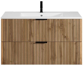 Szafka łazienkowa wisząca ryflowana naturalny jasny i czarny, Szafka łazienkowa wisząca z białą umywalką, 2 szuflady z systemem soft close, szer. 100 x wys. 57 x gł. 46 cm - MADELA