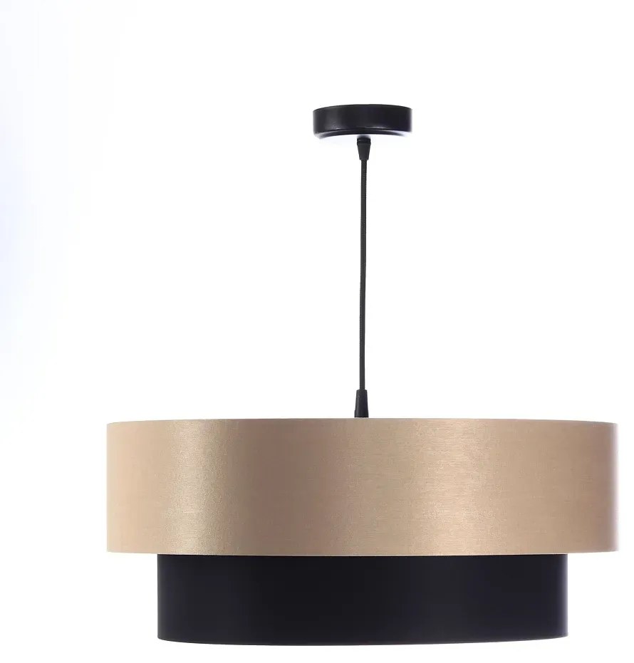 Lampa wisząca DOUBLE 50 czarna/kremowa nowoczesna na 1 żarówkę Ręcznie robiona lampa wisząca DOUBLE 50 z podwójnym abażurem Lampa wisząca DOUBLE 50 jest produktem polskim wykonywanym ręcznie, co sprawia, że lampa jest doskonale wykończona pod każdym względem. Podwójny abażur lampy pokryty jest tkaniną satynową zamocowaną na tworzywie sztucznym PCV. Zewnętrzny abażur ma kolor kremowy, a wewnętrzny czarny, co tworzy elegancką kompozycję pasującą zarówno do salonu, jak i sypialni, czy też innego pomieszczenia. Wnętrze lampy ozdabia srebrna matowa apla. Symetryczna lampa wisząca DOUBLE 50 cechuje się dużą odpornością na działanie promieni UV, dzięki czemu abażur nie traci swojego koloru po długim czasie użytkowania. Abażur wyczyścić można z kurzu za pomocą delikatnie zwilzonej ściereczki. Do lampy pasują żarówki E27 o maksymalnej mocy 60 Watt - można także zastosować żarówki LED. Lampa sprzedawana jest bez żarówki. Cechy produktu produkt polski, nowoczesne wzornictwo, podwójny abażur pokryty tkaniną satynową w kolorze czarnym matowym i kremowym błyszczącym na tworzywie sztucznym, wnętrze lampy ze srebrnej matowej apli, do lampy pasuje żarówka E27 max. 60 W, brak żarówki w zestawie, przewód czarny o długości 80 cm, podsufitówka metalowa czarna, w swojej ofercie posiadamy szeroki wybór mebli pozwalających na kompleksowe wyposażenie mieszkania