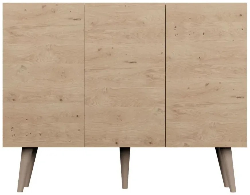 Komoda TORONTO dąb artisan do salonu I sklep meblowy MIRAT. Polskiej produkcji komoda TORONTO do salonu Komoda TORONTO zaprojektowana została z myślą o wnętrzach nowoczesnych oraz tych urządzonych w stylu skandynawskim. Ta komoda do salonu jest produktem polskim wykonanym z wysokiej jakości laminowanej płyty wiórowej o grubości 18 mm. Kolorystyka korpusu i frontów dąb artisan sprawia, że mebel ten pasować będzie do wielu aranżacji, a do tego jest ona ponadczasowa. Wysokie nóżki komody skonstruowane są z naturalnego, litego drewna bukowego pokrytego bezbarwnym lakierem. Dzięki zastosowaniu wysokich nóżek możliwe jest bezproblemowe uprzątnięcie podłogi pod meblem, ale też łatwo zmieści się pod nim robot sprzątający. Komoda z drzwiczkami to doskonały wybór do salonu, sypialni, czy też pokoju młodzieżowego, gdyż zapewni dużą ilość miejsca do przechowywania odzieży oraz innych przedmiotów. W komodzie znajduje się troje drzwiczek, a za każdymi jest półka, którą można regulować na 3 poziomach. Użyte w komodzie zawiasy puszkowe są bardzo łatwe w montażu, a ich kąt otwarcia wynosi 110 stopni. Atutem nowoczesnej komody TORONTO jest system cichego domyku. Możliwość zamocowania komody do ściany zapewnia, że mebel jest stabilny. Producent zaleca, aby komodę czyścić przy pomocy miękkiej ściereczki oraz aby unikać silnych środków chemicznych. Cechy produktu produkt polski konstrukcja z płyty wiórowej laminowanej o grubości 18 mm, obrzeża oklejone ABS/PCV o grubości 0,8-1,0 mm, nogi z lakierowanego litego drewna bukowego, płyta HDF lakierowana o grubości 3 mm, 5 nóg mocowanych przy pomocy wkrętów, 3 szafki zamykane (każda z półką wewnątrz z 3 poziomami regulacji co 6,4 cm), zawiasy puszkowe o kącie otwierania drzwi 110 stopni z systemem cichego domyku, możliwość montażu środkowych drzwi prawo/lewo, maksymalne obciążenie półki: 5 kg, maksymalne obciążenie blatu: 30 kg do samodzielnego montażu, w swojej ofercie posiadamy szeroki wybór mebli pozwalających na kompleksowe wyposażenie mieszkania.