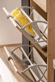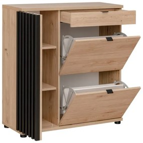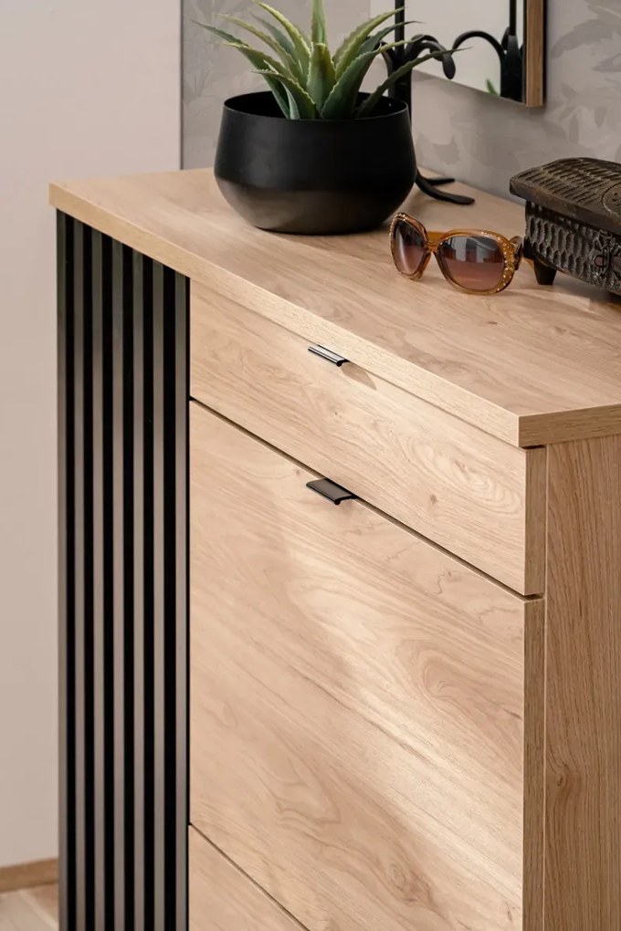 Komoda PEDRO hickory jackson/czarna z szufladami I sklep meblowy MIRAT. Nowoczesna komoda PEDRO z lamelami do przedpokoju Wysoka komoda PEDRO to doskonała propozycja mebla do przedpokoju, który ułatwi Ci organizacje przechowywanych rzeczy oraz pomoże zachować ład i porządek w przedpokoju. Ten praktyczny mebel posiada różne przegródki, dzięki czemu przechowasz w nim różnorodne rzeczy od butów po czapki, szaliki lub rękawiczki. Uchylne szuflady zapewnią miejsce na Twoje obuwie, a część z półkami schowanymi za drzwiczkami na drobne elementy ubioru lub inne rzeczy, które usprawnią Twoje przygotowania do wyjścia z domu. Dodatkowa szuflada na drobiazgi sprawi, że klucze i inne drobne elementy będą zawsze pod ręką. Komoda została wykonana z trwałej i solidnej płyty laminowanej w wybarwieniu hickory jackson, które imituje naturalne drewno. Naturalny kolor komody doda przytulności w Twoim przedpokoju, a ozdobne lamele w czarnym kolorze, które zdobią drzwiczki, nadają niesamowitego efektu 3D we wnętrzu. Komoda PEDRO to nie tylko mebel, który ułatwi Ci funkcjonowanie każdego dnia, ale także wspaniała ozdoba przedpokoju, który stanowi wizytówkę Twojego domu. Cechy produktu: wysoka komoda do przedpokoju, wykonana z płyty laminowanej, kolor hickory jackson, drzwiczki ozdobione czarnymi lamelami, komoda z półkami i szufladami, uchylne szuflady na buty, szuflada na drobiazgi, uchwyty z tworzywa sztucznego, do samodzielnego montażu, w swojej ofercie posiadamy szeroki wybór mebli pozwalających na kompleksowe wyposażenie mieszkania.