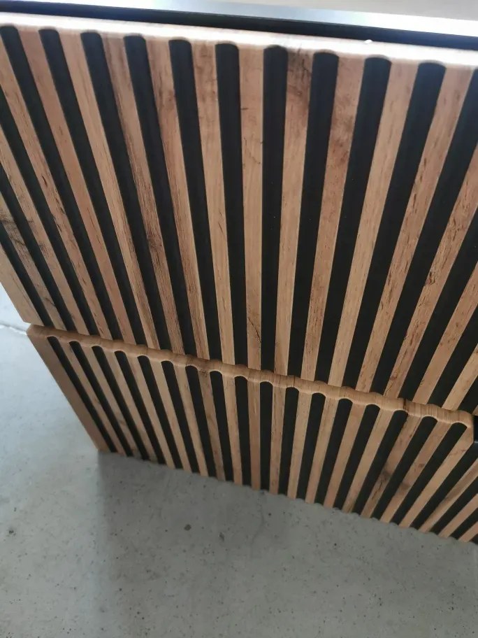 Szafka pod umywalkę nablatową XILO BLACK WOTAN 82 100cm czarna/dąb - powystawowa I sklep meblowy MIRAT. Wisząca szafka łazienkowa pod umywalkę XILO BACK WOTAN 82 100cm w stylu loftowym Szafka pod umywalkę XILO BLACK WOTAN 82 to model powystawowy noszący widoczne ślady po montażu i użytkowaniu. Szuflada z tyłu posiada wyszczerbienia na obrzeżach, dno dolnej szuflady jest połamane w lewym tylnym rogu. Dna obu szuflad noszą liczne zarysowania. Ze względu na uszkodzenie tyłu szuflady dolnej po lewej stronie niemożliwe jest odpowiednie umiejscowienie prowadnicy, przez co front szuflady opada. Krawędzie płyt posiadają odpryski laminatu. Wszystkie uszkodzenia przedstawione są na załączonych zdjęciach. Szafka wysyłana jest złożona na palcie. Szafka pod umywalkę XILO BLACK WOTAN 82 to propozycja nowoczesnego mebla, który oprócz swoich walorów wizualnych zapewni swobodne korzystanie z umywalki i pomoże w organizacji przechowywanych przedmiotów. Szafka posiada dwie pojemne szuflady, które zapewnią miejsce na ulubione kosmetyki lub akcesoria łazienkowe. Konstrukcja pozwala na umieszczenie w każdej z szuflad przedmiotów o wadze do 5 kg. Szuflady zostały osadzone na kulkowych prowadnicach zapewniających płynne i swobodne ich otwieranie i zamykanie. Dodatkowo zastosowany system cichego domyku, pozwala na bezgłośne zamykanie. Stabilność i trwałość szafki zapewnia wykonanie jej z wytrzymałej laminowanej płyty, która cechuje się dodatkowo bardzo dobrą odpornością na wilgoć, co jest szczególnie ważne w takich pomieszczeniach jak łazienka. Wisząca szafka optycznie nadaje lekkości i przestrzenności w pomieszczeniu, a dodatkowo ułatwia sprzątanie, ponieważ bez trudu dotrzemy w każdy zakamarek pod szafką. Szafka pod umywalkę XILO BLACK WOTAN 82 to mebel, który oprócz swoich zalet praktycznych sam w sobie będzie stanowić ozdobę w każdej łazience. Modne regularne frezowania wydobywające czerń w połączeniu z dębowym wykończeniem frontów nadają meblowi przestrzennej kompozycji 3D. Połączenie płyt w czarnym matowym kolorze i dąb wotan nadaje szafce surowego charakteru, który idealnie wkomponuje się we wnętrzach utrzymanych w loftowym stylu. Jeśli więc szukasz do swojej łazienki funkcjonalnej, ale i designerskiej szafki pod umywalkę to XILO BLACK WOTAN 82 100 cm będzie doskonałym wyborem. Umywalka na zdjęciach aranżacyjnych ma charakter poglądowy. Cechy produktu: szafka wisząca, korpus płyta laminowana, fronty ryflowane z płyty MDF-PCV 16 mm, kolor czarny/dąb wotan, szuflady na kulkowych prowadnicach, cichy domyk, uchwyty z tworzywa sztucznego, max. obciążenie szuflad po 5 kg, w swojej ofercie posiadamy szeroki wybór mebli pozwalających na kompleksowe wyposażenie mieszkania.