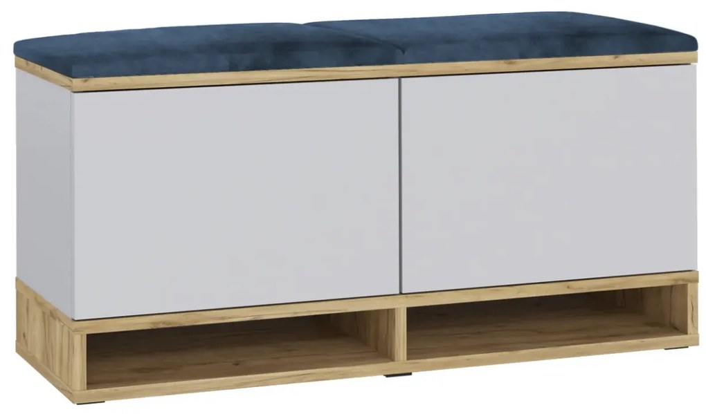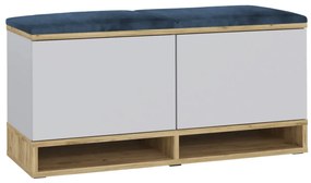 Szafka na buty z siedziskiem i wieszakiem DUBAI biała/dąb craft/granatowa I sklep meblowy MIRAT. Funkcjonalna szafka na buty DUBAI do przedpokoju Szafka z siedziskiem DUBAI wykonana jest z solidnej płyty meblowej laminowanej, która zapewnia jej wytrzymałość na wilgoć, zarysowania oraz zabrudzenia, co przekłada się na jego długą żywotność. Dzięki zastosowanemu laminatowi szafka jest prosta w codziennej pielęgnacji. Obrzeża wykonane z tworzywa ABS, które nie tracą koloru pod wpływem słońca, chronią mebel przed uszkodzeniami mechanicznymi, jakie mogą wystąpić w trakcie codziennego użytkowania. Ten ekologiczny i nowoczesny materiał cechuje się odpornością na wilgoć i wysokie temperatury, co czyni szafkę DUBAI wyjątkowo trwałą. Szafka w tej wersji została wzbogacona o ściankę z sześcioma wieszakami oraz półkę na dodatki, co zwiększa jej funkcjonalność. Siedzisko tapicerowane miękkim welurem, wypełnione gąbką, jest nie tylko komfortowe, ale także odporne na ścieranie, mechacenie i łatwe w utrzymaniu. Panele mocowane są bezpośrednio do ściany za pomocą kleju lub rzepów montażowych. W opcjach wyboru znajdziesz mocny klej, który ułatwi Ci ich przyklejenie. Szafka DUBAI to świetny wybór do przedpokoju, który łączy praktyczność z nowoczesnym wyglądem. Jej dwudrzwiowa konstrukcja jest nie tylko pojemna, ale także elegancka, co sprawia, że doskonale wpasuje się w różne aranżacje. Dzięki dodatkowym wieszakom i półce umieszczonym na tylnej ściance łatwiej jest zorganizować odzież wierzchnią. Dwie otwarte półki zapewniają wygodne miejsce na buty, co pozwala utrzymać porządek w przedpokoju – miejscu, które jest pierwszym, jakie widzą odwiedzający. Szafka DUBAI, inspirowana prostotą stylu loftowego i skandynawskiego, harmonijnie komponuje się z każdym wnętrzem. Wbudowane siedzisko nie tylko ułatwia zakładanie obuwia, ale także dodaje przytulności, a miękkie welurowe wykończenie podnosi zarówno komfort, jak i estetykę. Cechy produktu: produkowana w polskiej, doświadczonej firmie, solidna konstrukcja (matowa płyta laminowana 18 mm + obrzeże ABS 0,6 mm), szafka z płyty laminowanej z obrzeżami ABS, szafka z tapicerowanym welurowym siedziskiem z gąbką tapicerską w kilku wariantach kolorystycznych, szafka dwudrzwiowa z półkami o głębokości 37 cm, otwieranie szafek typu 'push to open', dwie półki otwarte pod szafką o wysokości 8 cm, tapicerowany panel z 6 wieszakami z 12 haczykami, półka o głębokości 15 cm na panelu, kolor biały mat/dąb craft, konieczność zaopatrzenia się w klej montażowy lub rzepy, mocowanie bezpośrednio do ściany, do samodzielnego montażu, w swojej ofercie posiadamy szeroki wybór mebli pozwalających na kompleksowe wyposażenie mieszkania.