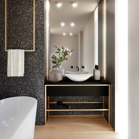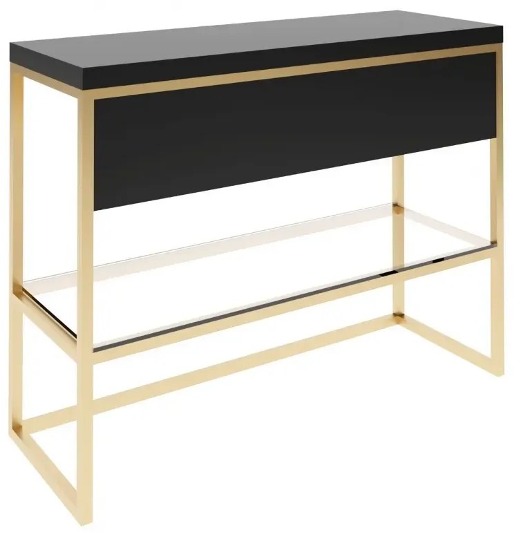 Szafka pod umywalkę nablatową BOSTON GOLD 120 cm złoty/czarny ze szklaną półką I sklep meblowy MIRAT. Elegancka szafka pod umywalkę nablatową BOSTON GOLD w stylu glamour Szafka pod umywalkę nablatową BOSTON GOLD 120 cm została stworzona z myślą o komfortowym i bezpiecznym użytkowaniu, a dzięki zastosowaniu wysokiej jakości materiałów będzie służyła wiele lat w idealnym stanie. Płyta akrylowa, z której wykonano blat, jest niezwykle odporna na zarysowania, a dzięki dodatkowemu zabezpieczeniu przed działaniem wilgoci doskonale sprawdzi się w łazience. Uniwersalność szafki umożliwia aranżację szafki według własnego pomysłu, nie posiada wyciętego otworu na przyłącze umywalkowe, dzięki temu użytkownik może dowolnie ustawić umywalkę, zyskując dodatkową przestrzeń wokół misy. Szafka łazienkowa wyposażona jest w szklaną półkę, która nie tylko dodaje wyjątkowego uroku, ale także jest praktycznym elementem, który zapewnia odpowiednią ilość miejsca na niezbędne, w zasięgu ręki, akcesoria łazienkowe. Szkło jest bardzo szlachetnym materiałem, a przy tym jest bardzo proste w utrzymaniu czystości, bez problemu można z niego usunąć ślady po rozlanym kosmetyku. Płyta akrylowa z przodu szafki została zaprojektowana z myślą o skutecznym ukryciu syfonu, co sprawia, że łazienka będzie prezentowała się bardzo estetycznie. Stalowa konstrukcja szafki jest w całości spawana, co pozwoliło uzyskać bardzo stabilny mebel z zachwycającym wykończeniem. Połyskujący, złoty kolor konstrukcji szafki nadaje jej wyrafinowania, sprawia wrażenie obfitości i zawsze przyciągnie wzrok Twoich gości. Szafka pod umywalkę nablatową BOSTON to idealny mebel dla osób pragnących dodać swojej łazience odrobinę luksus i ciepła, a połączenie czerni, złota i szkła tworzy perfekcyjną kompozycję w stylu glamour. Cechy produktu: blat z płyty akrylowej, płyta akrylowa zabezpieczona przed działaniem wilgoci, stalowa, złota konstrukcja spawana w całości, pojemna, szklana półka o grubości 8 mm, brak wyciętego otworu na przyłącze umywalki, niezwykle funkcjonalny mebel, w swojej ofercie posiadamy szeroki wybór mebli pozwalających na kompleksowe wyposażenie mieszkania.